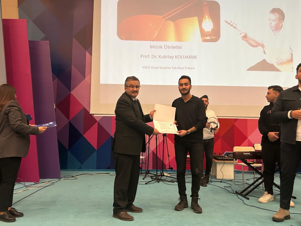 The program continued with Kırşehir Deputy Governor Alper Balcı presenting a gift to Prof. Dr. Aykut Gül. During the event, certificates of appreciation were given to the academics who contributed to the music recital performed by the academics of the Neşet Ertaş Faculty of Fine Arts.